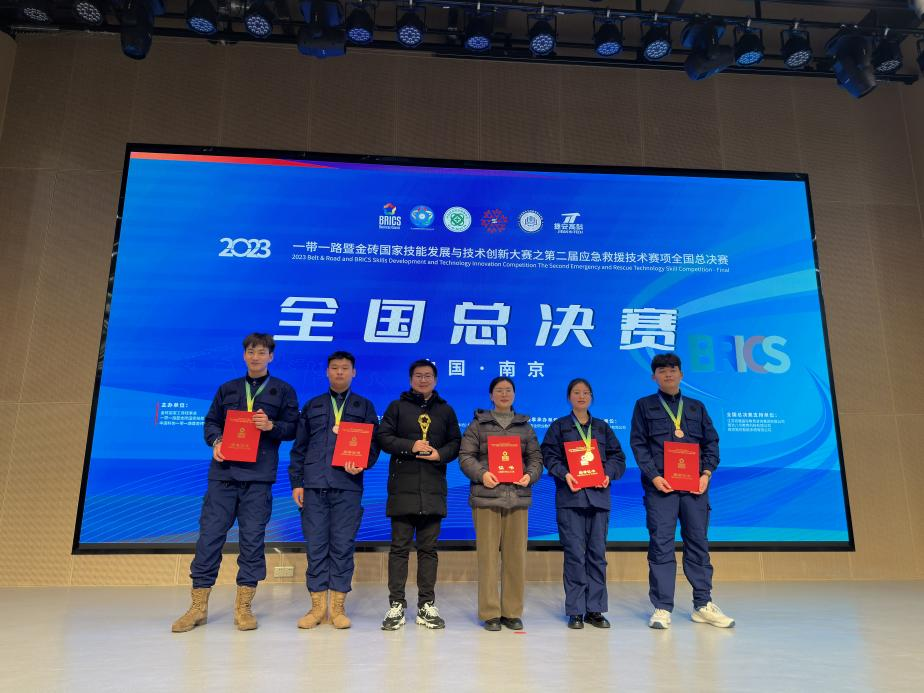 2023年12月16日,2023一带一路暨金砖国家技能发展与技术创新大赛之第二届应急救援技术赛项全国总决赛在南京开幕,来自全国 30 多所高职院校的150 多名学生参加了比赛。在我院马会腾、曹曦娇、谢鑫芳老师的指导下,谢硕、秦军、郭玟锗、李明通四位参赛同学顽强拼搏,一路披荆斩棘,荣获A赛项(安全生产管理技能赛项)全国一等奖,B赛项(应急救援技能赛项)全国三等奖!我校荣获最佳组织奖!