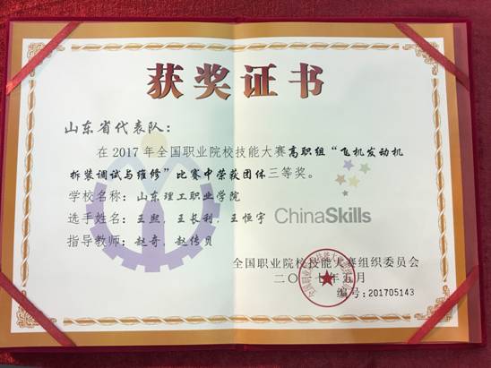 5月18日—5月19日,由教育部主办,中国民用航空局人事科教司、广东省教育厅承办,全国民航职业教育教学指导委员会、广州民航职业技术学院协办的2017年全国职业院校技能大赛(高职组)“飞机发动机拆装调试与维修”赛项在广州白云机场校区举行。山东理工职业学院、广州民航职业技术学院、中国民用航空飞行学院、成都航空职业技术学院、上海民航职业技术学院、长沙航空职业技术学院、三亚航空旅游职业学院和西安航空职业技术学院等来自全国14个省市、21所院校的26个代表队、78名参赛选手共聚广州,上演激烈的角逐,最终我院参赛队荣获三等奖第一名,突破我院在全国职业技能大赛零的历史。