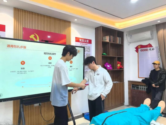 此外,针对校园生活中可能出现的意外情况,负责人还讲解了手臂绷带包扎的实用技巧,通过现场演示和分步指导,让同学们快速掌握了环形包扎、螺旋包扎等基础包扎方法,为应对日常小外伤提供了有效帮助。