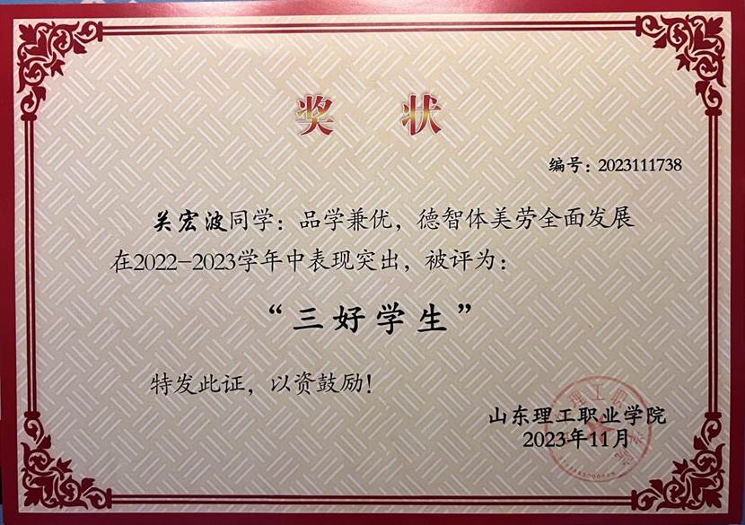 关宏波,男,2002年12月出生,山东济宁人,中共预备党员,就读于山东理工职业学院航空