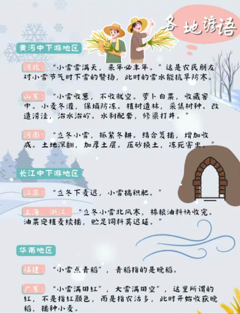 对于农民来说,小雪是一个重要的农事节气。“小雪雪满天,来年必丰年”,此时,北方的冬小麦需要覆盖一层薄雪以保持土壤湿度,而南方则忙于收获晚稻,准备越冬,他们要抓紧时间完成农作物的收获和播种。
