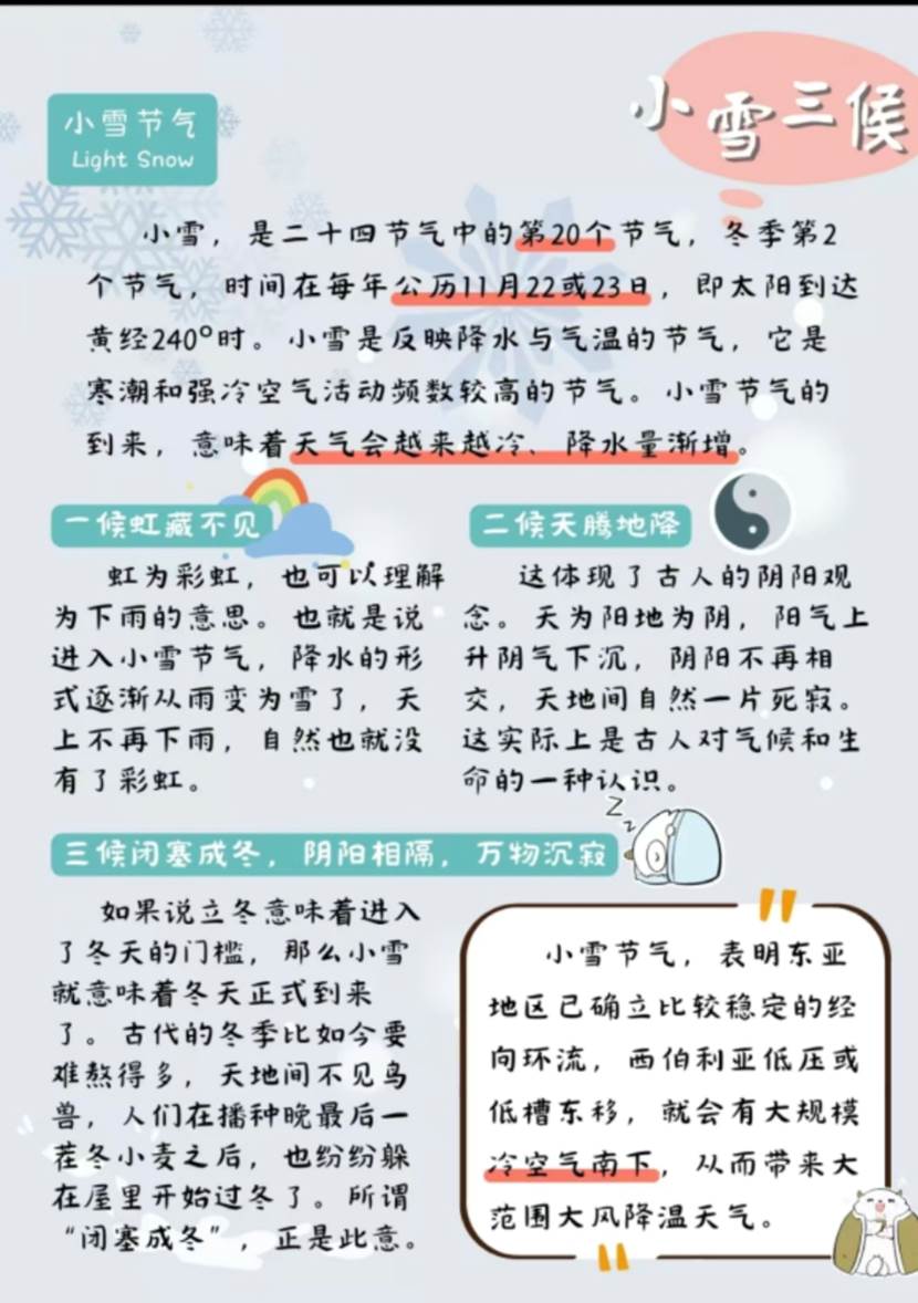 小雪时节,中国大部分地区气温逐渐下降,北方地区可能会迎来初雪,而南方则可能还处于深秋的余温中。这个时期,天气干燥,降水减少,但寒意渐浓,同学们也要注意开始增添衣物,准备迎接更冷的日子。