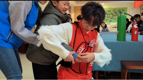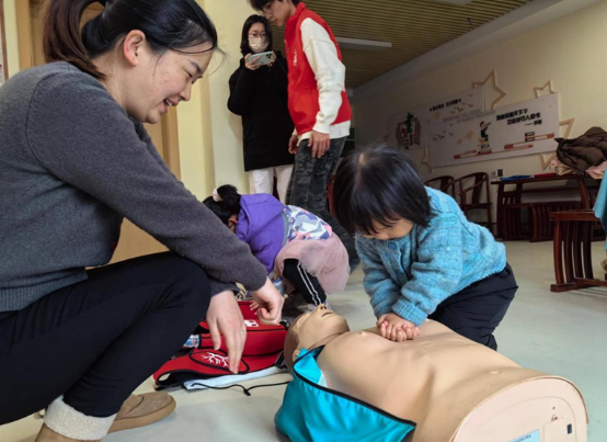 “心脏骤停后的4分钟是抢救的黄金时间,正确的心肺复苏能为患者赢得生机。”协会负责同学一边讲解,一边在人体模型上进行示范。从评估环境、判断意识、呼救求助,到胸外按压的位置、深度、频率,以及人工呼吸的要点,每一步都细致拆解。在志愿者指导下,小朋友们轮流上前,在模型上进行实战练习。