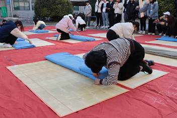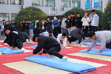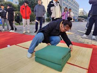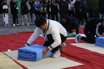 开幕式现场举行了叠军被比赛。比赛分为男子组和女子组,以班级为单位分别派出两名同学参加。主持人宣读完开幕致辞和比赛规则后,比赛正式开始了,参赛选手迅速进入状态。“八仙过海,各显神通”,参赛选手通过“折、压、磨、捏、修”等一系列动作来给自己的“豆腐块”凹造型。